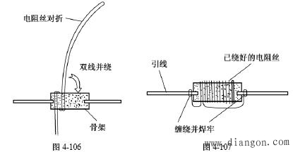 ④ 电阻丝绕制结束后,将其两个线头分别缠绕固定在左右两端的引线上,并将其焊牢,如图4-107所示。