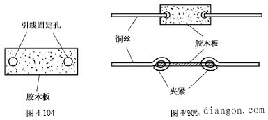 ① 用一小块胶木板制成约10mm长、5mm宽的骨架,在骨架两端各钻一小孔用于固定引线,如图4-104所示。