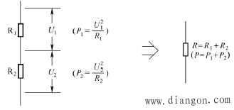 图4-102所示为两个不同阻值的电阻R1、R2相串联时的情况。由于两电阻R1、R2的阻值不同,使得每个电阻上的电压降U1、U2各不相同,导致R1、R2实际所承受的功率P1、P2也不相同。因此,R1、R2串联后的等效电阻R的总功率P,不是R1、R2两电阻标称功率之和,而是R1、R2两电阻实际承受功率之和。R1实际承受功率P1 = U12/R1;R2实际承受功率P2 = U22/R2,所以R1、R2串联后的等效电阻的总阻值R = R1+R2,总功率P = P1+P2。