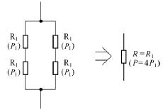 (3)用4个相同阻值、相同功率的电阻串并联,可以实现阻值不变而功率增大到原来的4倍。如图4-103所示,4个R1串并联后,其等效电阻的总阻值R = R1,总功率P = 4P1。