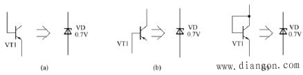 (2)晶体三极管代替稳压二极管。利用硅三极管的一个PN结可作为0.7V稳压二极管使用,如图4-129所示。图4-129(a)采用NPN管,VT1基极作为稳压二极管VD的负极(稳压输出端),VT1发射极作为VD的正极(一般接地)。图4-129(b)采用PNP管,VT1集电极作为稳压二极管VD的负极,VT1基极作为VD的正极。图4-129(c)采用NPN管,VT1基极与集电极连接在一起作为稳压二极管VD的负极,VT1发射极作为VD的正极。
