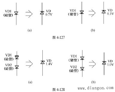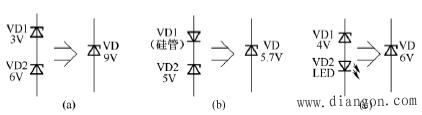没有合适稳压值的稳压二极管时,可以将两个或更多个稳压二极管正向串联使用,也可以将稳压二极管与其他二极管串联使用,以使稳压值符合需要。图4-131(a)所示为两个稳压二极管VD1与VD2正向串联,等效为一个稳压二极管VD,VD的稳压值为VD1和VD2稳压值之和。图4-131(b)所示为一个整流二极管VD1与一个稳压二极管VD2相串联,等效为一个稳压二极管VD,VD的稳压值为VD1和VD2稳压值之和。图4-131(c)所示为一个稳压二极管VD1与一个发光二极管VD2相串联,等效为一个稳压二极管VD,VD的稳压值为VD1和VD2稳压值之和。
