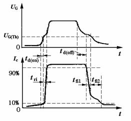 IGBT的关断过程较为复杂,其中UG由正常15V降至开启电压UT所需时间为关断延迟时间td(off),自此IC开始衰减。集电极电流由90%额定值下降至10%额定所需时间为下降时间tfi=tfi1+tfi2,其中tfi1对应器件中MOSFET部分的关断过程,tfi2对应器件中PNP晶体管中存贮电荷的消失过程。由于经tfi1时间后MOSFET结构已关断,IGBT又未承受反压,器件内存贮电荷难以被迅速消除,所以集电极电流需较长时间下降,形成电流拖尾现象。由于此时集射极电压Uce已建立,电流的过长拖尾将形成较大功耗使结温升高。总的关断时间则为toff=td(off)+tfi。