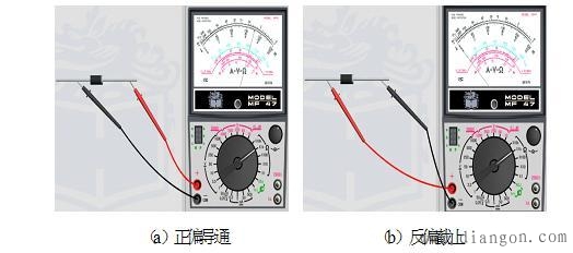 如下图所示,万用表的红、黑表笔分别接二极管两端,若测得电阻小(几千欧以下),再将红、黑表笔对调后接二极管两端,而测得的电阻大(几百千欧以上),两次测量的电阻值差别越大,说明二极管的性能越好。阻值小的那一次黑表笔接的是二极管的正极,红表笔接的是二极管的负极。