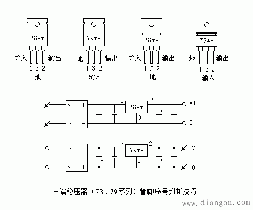 在78**、79**系列三端稳压器中,最常用的是TO-220和T0-202两种封装。这两种封装的图形及引脚序号、引脚功能如下图所示。