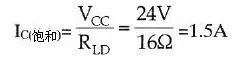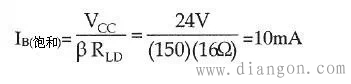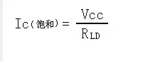 上式表出了IC和IB之间的基本关系,式中的β值代表三极管的直流电流增益,对某些三极管而言,其交流β值和直流β值之间,有着甚大的差异。欲使开关闭合,则其Vin值必须够高,以送出超过或等于(式1) 式所要求的最低基极电流值。由于基极回路只是一个电阻和基射极接面的串联电路,故Vin可由下式来求解