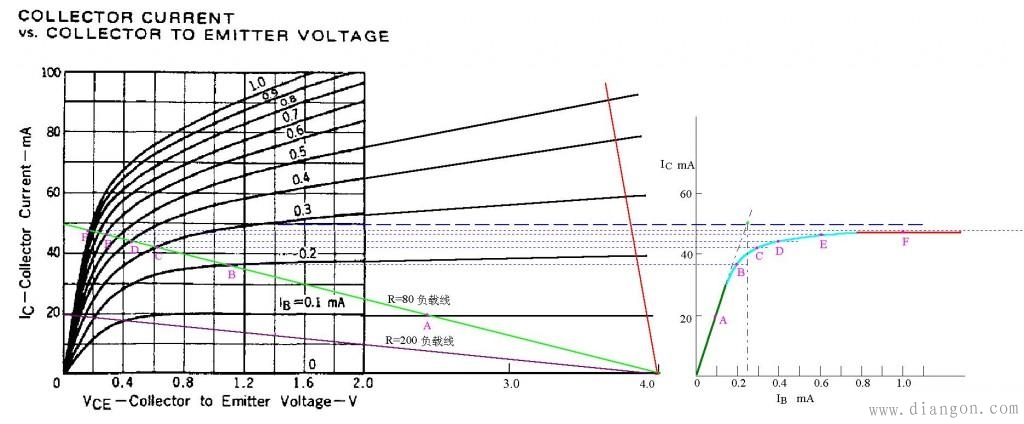 图中还画出了负载电阻为200欧姆时的负载线。可以看出,对应于Ib=0.1mA,负载电阻为80欧姆时,晶体管是处于线性放大区,而负载电阻200欧姆时,已经接近进入饱和区了。负载电阻由大到小变化,负载线以Vce=4.0为圆心呈扇状向上展开。负载电阻越小,进入饱和状态所需要的Ib值就越大,饱和状态下的C-E压降也越大。在负载电阻特别小的电路,例如高频谐振放大器,集电极负载是电感线圈,直流电阻接近0,负载线几乎成90度向上伸展(如图中的红色负载线)。这样的电路中,晶体管直到烧毁了也进入不了饱和状态。以上所说的“负载线”,都是指直流静态负载线;“饱和”都是指直流静态饱和。