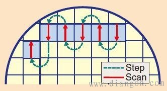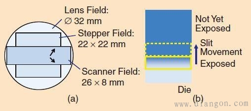 3. 一块晶圆上有很多die,每一个die上都刻有相同的电路图案,即一块晶圆可以出产很多芯片。一个die典型的尺寸是26×32mm。光刻机主要有两种,一种叫做stepper,即掩膜版和晶圆上的某一个die运动到位后,光源开、闭,完成一次光刻,然后晶圆运动使得下一个die到位,再进行一次光刻,依此类推。而另一种光刻机叫做scanner,即光线被限制在一条缝的区域内,光刻时,掩膜版和晶圆同时运动,使光线以扫描的方式扫过一个die的区域,从而将电路图案刻在晶圆上(见下图(b))。scanner比stepper的优势在于,可以提供更大的die的尺寸。其原因在于,对于一个固定尺寸的圆透镜,比如直径32mm的圆(指投射后的区域大小),其允许透过的光线的区域尺寸是受限的。若采用stepper的step-and-expose方式进行光刻,一个die的区域必须能被包含在直径32mm的圆中,因此能获得的最大的die的尺寸为22×22mm;若采用scanner的step-and-scan方式,透镜能够提供的矩形区域长度可以到26mm(26×8mm)甚至更长,将光缝设置为这个尺寸,使用扫描的方式便可以获得26×Lmm的区域(L为扫描长度)。区域示意见下图(a)。同样的透镜在stepper下可以实现更大区域的意义在于,当你需要生产尺寸较大的芯片的时候,换一个更大的透镜的费用是昂贵的。
