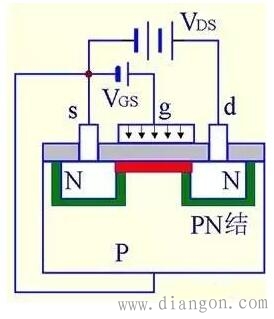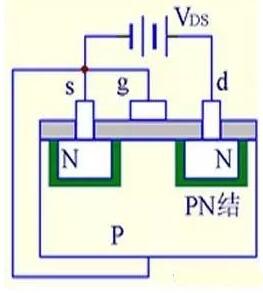 在一块浓度较低的P型硅上扩散两个浓度较高的N型区作为漏极和源极,半导体表面覆盖二氧化硅绝缘层并引出一个电极作为栅极。