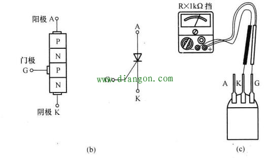 由单向晶闸管的结构可知,G极和K极间是一个PN结,类似一只二极管,具有单向导电特性,其正、反向阻值相差很大。而G极和A极间有两个反向串联的PN结,因此正、反向阻值均很大,据此可利用万用表判别出电极。
