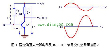 可见,IN信号电压上升使Ib在静态基础上往正方向变化时,Vc呈现反方向变化,从IN和OUT的关系看,为反相关系,由此可确定该放大器为反相放大器。