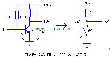 IN输入信号电压的下降(Vb为0.3V以下至0V),使Ib↓=0µA;Ic=0mA;Vc↑=10V。此时因Ic=0mA,Rc两端电压降为0V,Q1等效于SW1断开。三极管工作于截止状态。