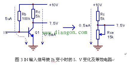 Ic↑的使Rc两端的电压降增大,Vc下降,从暗要素考虑,此时是Rce的变小,导致了Vc分压点的电压降低,那么可见Rce为一只可变电阻,而实际上,在放大区内,三极管工作于可变电阻区,其c、e极之间,确实呈现一只可变电阻的特性!当Vc=2.5V时,可知Rce由静态时的5k变为现在的2k.。因而我在图2干脆画出这只电阻来,并标示出各点电压和电流值。