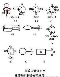f),g),h),i)是几种常见的绝缘栅场效应管的封装形式及引脚分布示意图。依次为金属封装的绝缘场效应管,单栅场效应管,双栅场效应管,环氧封装绝缘栅场效应管,塑料封装绝缘栅场效应管。