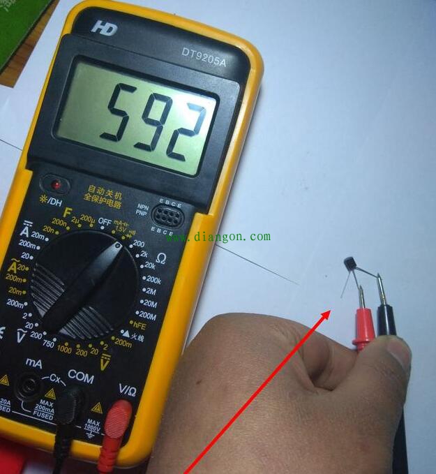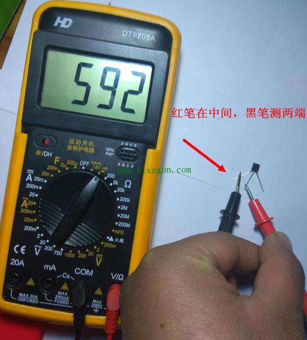黑笔在中间黑笔在中间,红笔测两端,如果都有读数,可以确定三极管是PNP型。确定了三极管是哪种类型以后,用三极管档位测量放大倍数。