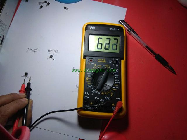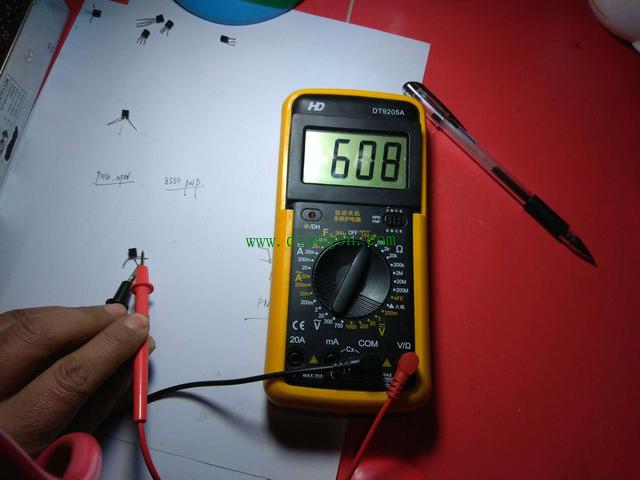 黑笔放中间,红笔接触两边的脚,你会发现都没有读数。下面我们换一个三极管。