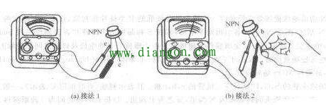 如果在“顺箭头,偏转大”的测量过程中,由于颠倒前后两次测量指针偏转角度都很小,实在难以区分,就要“动嘴巴”了,具体方法是,在“顺箭头,偏转大”的判别方法的两次测量中,用两只手分别捏住两表笔与管脚的结合部位,用嘴巴含住基极,仍用“顺箭头,偏转大”的判别方法即可区分出来集电极和发射极,其中原理是由于人体起到直流偏置电阻的作用,湿测量效果更加明显。