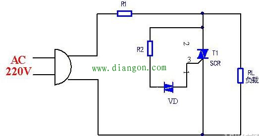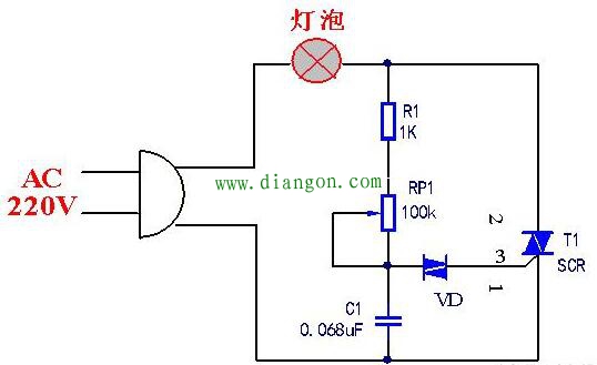 工作过程:当电路接通交流市电220V后,交流市电便通过负载电阻R1、电位器RP1 向电容器C1不断充电,当电容器C1上的充电电压高于双向触发二极管的转折电压时候,此时电容器C 便通过双向触发二极管VD向双向可控硅T1的控制极G放电,触发可控硅T1导通。