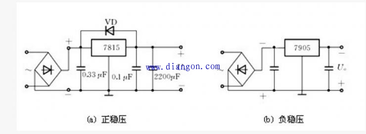 (1) 集成三端稳压器根据稳定电压的正、负极性分为78×××,79×××系列。附图给出了正、负稳压的典型电路。