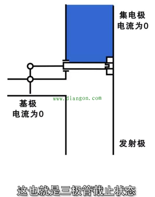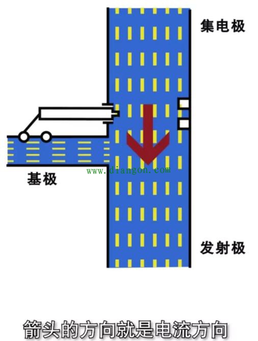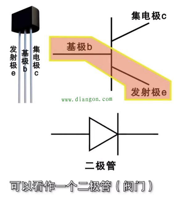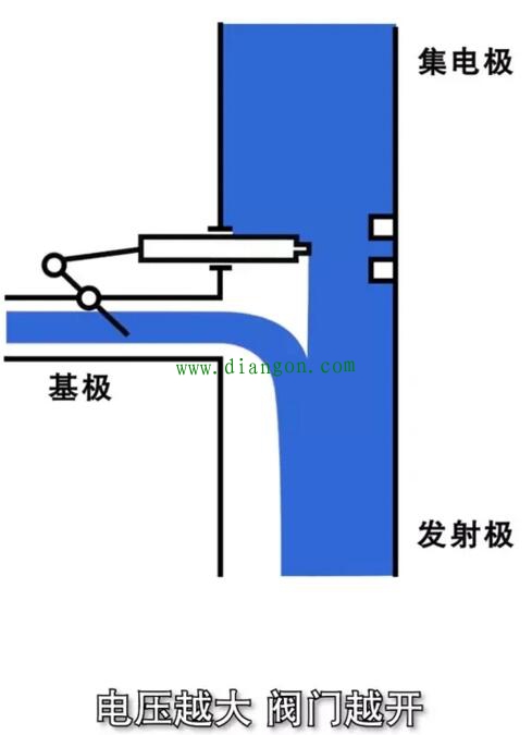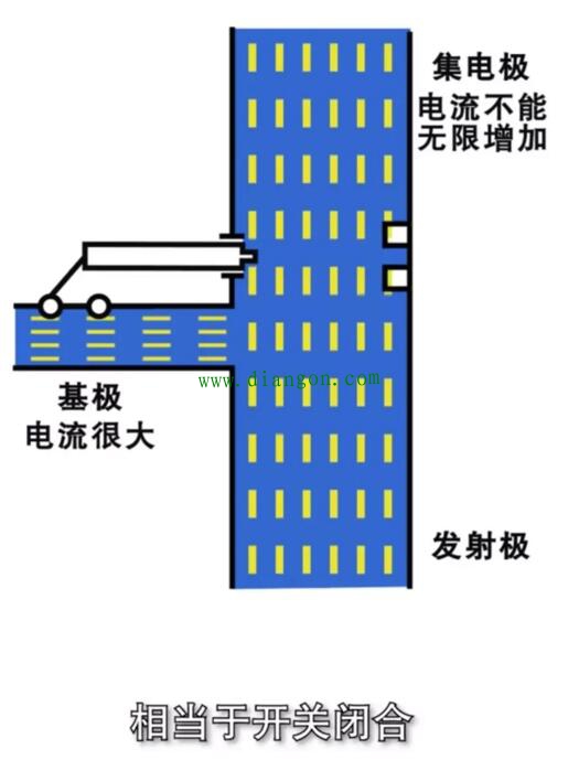 三极管可以看做一个小阀门控制大阀门的元件,基极和发射极原理为一个二极管,当给基极一个电压,基极和发射极就会导通,基极也就有了电流,这个时候集电极和发射极也会导通,如图3所示,当基极电压越大集电极流向发射极的电流也会越大,也就是阀门打开的越大,微弱的基极电流和大量的集电极电流都汇聚到发射极流出,当基极电流为0,集电极电流也就为0,这个时候就是阀门截止状态;当基极电流很大时,那么阀门也就打开最大,相当于开关闭合导通。
