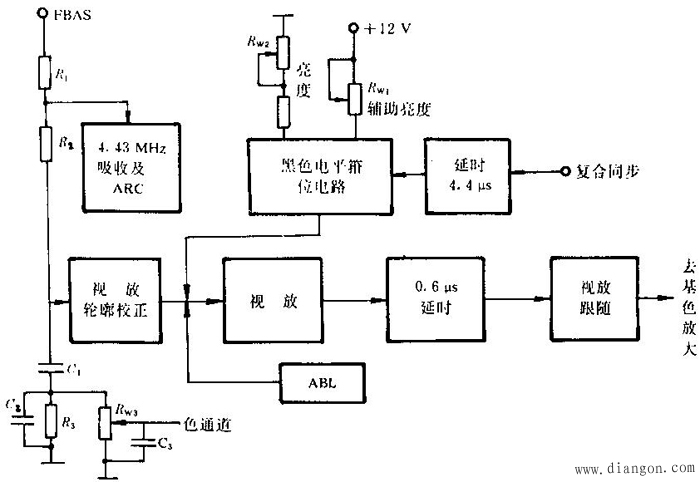 3. 亮度信号延时电路:因为亮度通道产生的延时比色度分量通过色度通道产生的延时小,为避免延时差会导致图像的亮度和色彩在屏幕上产生水平距离误差。需采用延时电路。