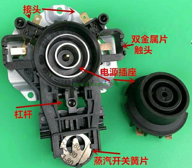 3.水开以后不能断电;这是蒸汽开关失灵所致,由于这个装置频繁动作,且处于潮湿工况,因此这是一种最常见的故障。大多数情况下是生锈所致,也可能材质不良,时间长了性能改变,如果有生锈等异物清除即可;还有可能是蒸汽导管错位蒸汽到不了簧片上;