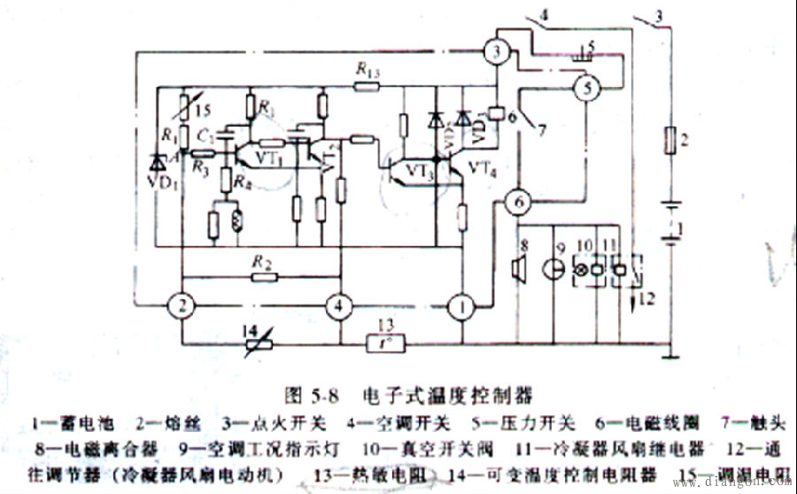 当发动机转速达到规定的怠速转速时,VT2导通,VT3截止,VT4导通,继电器通电吸合,电磁离合器接合,压缩机工作;