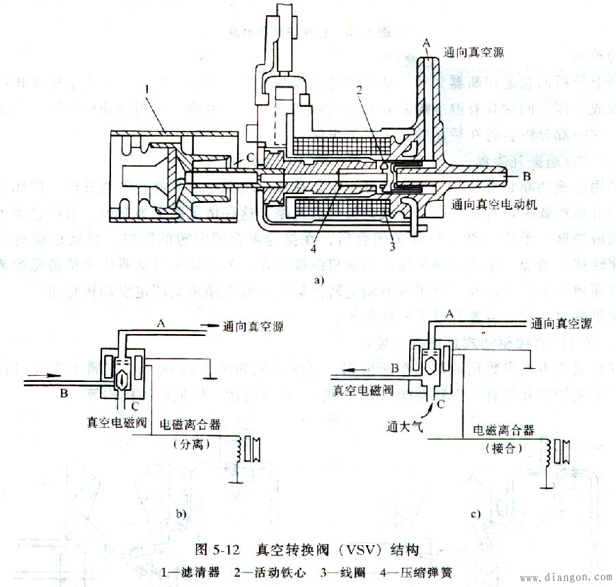 VSV阀两个管口:一个接真空源;另一接真空马达;有怠速调整螺钉;怠速900~1000转/分正常。