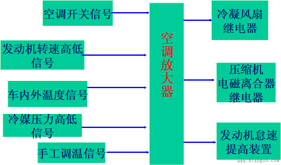 怠速的提升靠通过发动机的怠速控制阀完成;发动机电脑通过空调开关或空调压缩机工作的电位信号,检测空调器连接情况,以决定是否要提高发动转速。