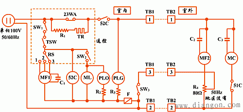 闭合电源开关SW1,在室内风扇电机MF1运转的同时,电磁接触器52C的线圈通电,使触点52C闭合,室外风扇电机MF2和压缩机电动机MC运转,进入制冷状态,压缩机电动机与风扇电动机采用PSC电路启动,只有运行电容C3和C2,无启动继电器。此时绿色指示灯PLG亮,表示系统处于制冷状态下工作。