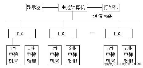 电梯监控系统是以计算机为核心的智能化监控系统,如图3所示。电梯监控系统由主控计算机、显示装置、打印机、远程操作台、通信网络、现场控制器DDC等部分组成。主控计算机负责各种数据的采集和处理,显示器用于显示监视的各种状态、数据等画面,以及作为实现操作控制的人机界面。管理人员可通过监控系统对电梯的运行状态进行干预,以便根据需要随时起动或停止任何一台电梯。当发生火灾等紧急情况时,消防监控系统及时向电梯监控系统发出报警和控制信息,电梯监控系统主机再向相应的电梯现场控制器装置发出相应的控制信号,使它们进入预定的工作状态。