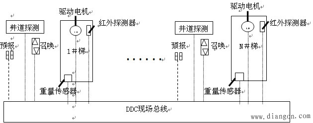 通过群控管理,可大大缩短候梯时间,改善电梯交通的服务质量,最大限度地发挥电梯作用,使之具有理想的适应性和交通应变能力。图2所示为电梯群控管理示意图,所有的探测器通过DDC总线连到控制网络,计算机根据各楼层的用户召唤情况、电梯载荷,以及根据井道探测器所提供的各机位置信息,进行运算后,响应用户的呼唤;在出现故障时,根据红外探测器探测到是否有人,进行响应的处理。