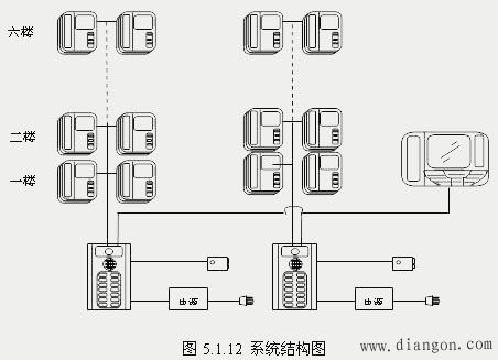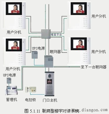 ③ 联网型:在封闭住宅小区中,每幢楼宇使用单元型楼宇对讲系统,然后所有的单元型楼宇对讲系统通过小区内专用总线与管理中心连接(联网),形成小区各单元楼宇之间的对讲网络。如图5.1.11所示。