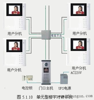 ② 单元型:独立楼宇使用的系统称为单元型对讲系统,如图5.1.10所示。其特点是可管理同一幢楼里的多个楼层、多家住户的访客对讲。单元楼设置一台门口主机,可根据单元楼层的多少、每层住户的多少来选择门口主机的规格型号和操作方式。常用的操作方式有直按式、数码式二种,直按式是指门口主机上直接设置每家住户的门牌号按键,访客一按就应,操作简单。但直按式主机容量较小,通常可控制2~16户,适用于一梯二户七层高的住宅。数码式是指门口主机上设置0~9数字按键,操作方式如同拨电话一样,访客需要根据住户门牌号依次按动相应的数字键,操作稍复杂一些。但数码式主机的容量较大,可从2~9999户不等,适用于高层住宅。