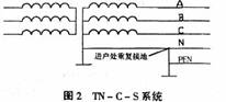 该系统一般用在建筑物的供电由区域变电所引来的场所,进户之前采用TN-C系统,进户处做重复接地,进户后变成TN-S系统。TN-C系统前面已作分析。TN-S系统的特点是:中性线N与保护接地线PE在进户时共同接地后,不能再有