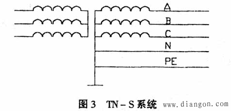 TN-S是一个三相四线加PE线的接地系统。通常建筑物内设有独立变配电所时进线采用该系统。TN-S系统的特点是,中性线N与保护接地线PE除在变压器中性点共同接地外,两线不再有任何的电气连接。中性线N是带电的,而PE线不带电。该接地系统完全具备安全和可靠的基准电位。只要象TN-C-S接地系统,采取同样的技术措施,TN-S系统可以用作智能建筑物的接地系统。如果计算机等电子设备没有特殊的要求时,一般都采用这种接地系统(见图3)。