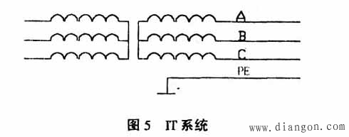 电压(220V),保护接地线PE各自独立接地。该系统的优点是当一相接地时,不会使外壳带有较大的故障电流,系统可以照常运行,缺点是不能配出中性线,因此它是不适用于拥有大量单相设备的智能化大楼的(见图5)。