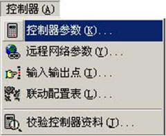 在主界面的菜单栏上单击控制器(A),将出现控制器(A)下拉式菜单,如下图 ,在此菜单中您可以设置控制器参数、输入输出点、联动配置表和校验 控制器资料。