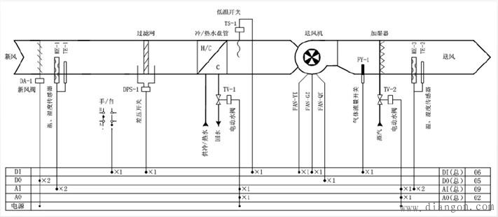室内恒温器通过对房间的温度检测,控制冷水或热水电动阀的开启和关闭来改善房间温度。同时,设定风机在不同的速度下工作,也可以改善房间的温度。末端风机盘管和新风机组联合使用,不需要由DDC控制器参与对它的控制和调节。