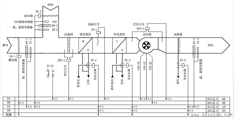 空气处理机采用集中送风的控制方式,通过检测回风的温度、湿度、来决定是否对电动冷/热水阀和加湿阀进行调节。