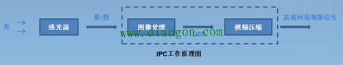 摄像头的工作原理大致为:光(景物)通过镜头(LENS)生成的光学图像投射到图像传感器表面上,然后转为电信号,经过A/D(模数转换)转换后变为数字图像信号,再送到数字信号处理芯片(DSP)中加工处理进行视频编码压缩,再通过网线进行传输,后端通过电脑直接访问解码查看视频或者通过解码设备进行显示。