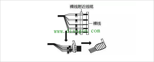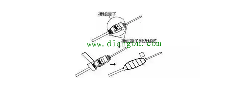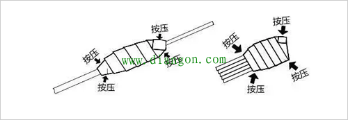 4、压紧接线端子两侧的防水胶带,达到绝缘密封,下图示左侧为接线端子按压方法,右侧为裸线按压方法。