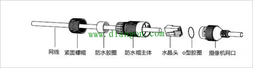 1、如您已布置好网线线缆,请将和摄像机连接的一端网口水晶头剪开,网线穿过如上图所示的紧固螺帽、防水胶圈、防水帽主体;