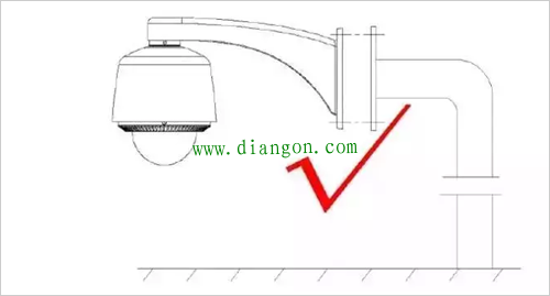 2、球机长臂装支架的注意事项:长壁装支架适合室外使用,支架具有一定的倾斜角度,球机不易进水,如下图所示;同时室外安装时长壁装支架也可以和抱柱装支架、墙角装支架配合使用。