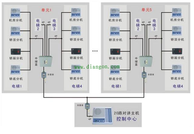 Ø管理中心机可与电梯轿厢、电梯机房、电梯顶部、电梯底部分机实现五方对讲;