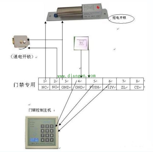 1、门禁主机上的+12V、GND端(门禁主机供电)接门禁电源的+12V、GND端。
