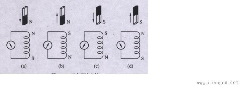 通过实验观察,我们发现:当磁铁插入线圈时,原磁通在增加,线圈所产生的感应电流的磁场方向总是与原磁场方向相反,即感应电流的磁场总是阻碍原磁通的增加。如右图(a)、(c)所示。当磁铁拔出线圈时,原磁通在减少,线圈所产生的感应电流的磁场方向总是与原磁场方向相同,即感应电流的磁场总是阻碍原磁通的减少,如右图(b)、(d)所示