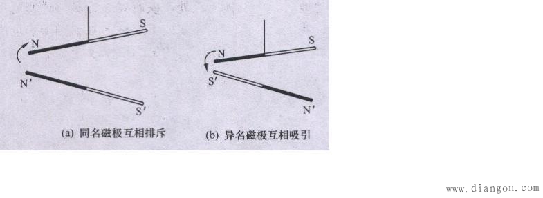当用一个条形磁铁靠近一个悬挂的小磁针(或条形磁铁)时,如下图所示。我们发现:当条形磁铁的N极靠近小磁针的N极时,小磁针N极一端马上被排斥;当条形磁铁的N极靠近小磁针的S极时,小磁针S极一端立刻被条形磁铁吸引。说明磁极之间存在相互作用力,同名磁极互相排斥,异名磁极互相吸引。