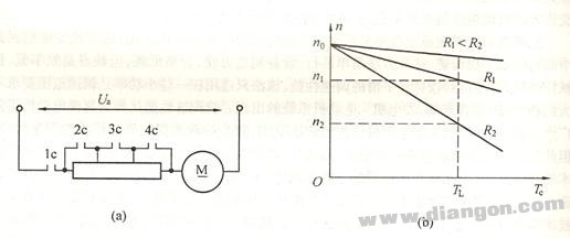 当负载一定时,随着串入的外接电阻Rw的增大,电枢回路总电阻R=(Ra+Rw)增大,电动机转速就降低。其机械特性如图1(b)所示。Rw的改变可用接触器或主令开关切换来实现。