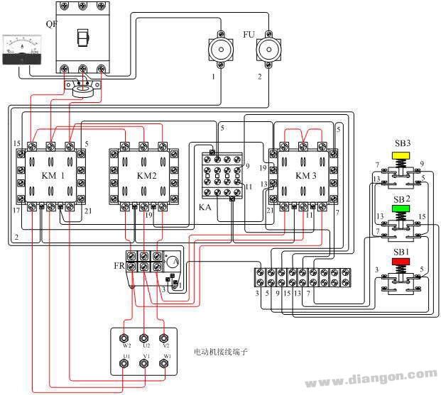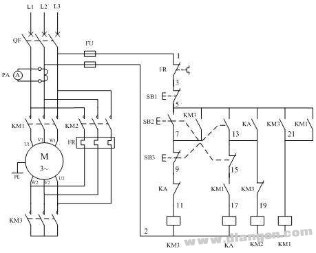 | 鼠笼式三相异步电动机Y-△降压手动控制电路原理图 凡正常运行时定子绕组接成三角形的是三相鼠笼式异步电动机,在启动时临时成星形,待电动机启动后接近额定转速时,在将定子绕组通过Y-△降压启动装置接换成三角形运行,这种启动方法叫Y-△降压启动。属于电动机降压启动的一种方式,由于启动时定子绕组的电压只有原运行电压的,启动力矩较小只有原力矩的,所以这种启动电路适用于轻载或空载启动的电动机。 线路分析如下: 1、合上空气开关QF接通三相电源, 2、按下启动按钮SB2,首先交流接触器KM3线圈通电吸合,KM3的三对主触头将定子绕组尾端联在一起。KM3的辅助常开触点接通使交流接触器KM1线圈通电吸合,KM1三对主常触头闭合接通电动机定子三相绕组的首端,,电动机在Y接下低压启动。 3、随着电动机转速的升高,待接近额定转速时(或观察电流表接近额定电流时),按下运行按钮SB3,此时BS3的常闭触点断开KM3线圈的回路,KM3失电释放,常开主触头释放将三相绕组尾端连接打开,SB3的常开接点接通中间继电器KA线圈通电吸合,KA的常闭接点断开KM3电路(互锁),KM3的常开接点吸合,通过SB2的常闭接点和KM1常开互锁接点实现自保,同时通过KM3常闭接点(互锁)使接触器KM2线圈通电吸合,KM2主触头闭合将电动机三相绕组连接成△,使电动机在△接法下运行。完成了Y-△接压启动的任务。 4、热继电器FR作为电动机的过载保护,热继电器FR的热元件接在三角形的里面,流过热继电器的电流是相电流,定值时应按电动机额定电流的 计算。 5、KM2及KM3常闭触点构成互锁环节,保证了电动机Y-△接法不可能同时出现,避免发生将电源短路事故。
